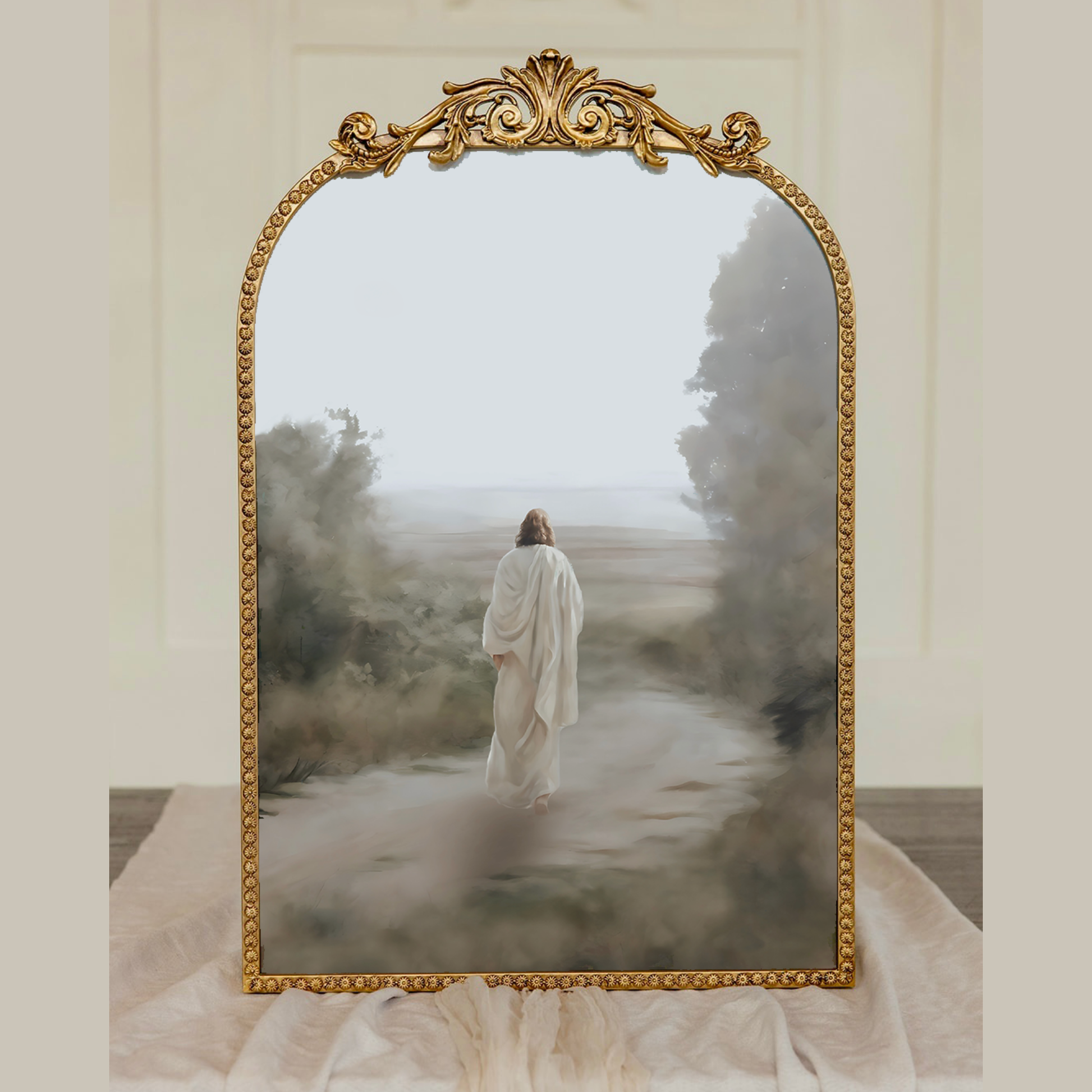 The largest piece, In His Footsteps, is displayed in a 20" × 27" vintage gold frame and features Jesus Christ walking along a sandy trail, footprints forming behind Him—an understated reflection on trust, direction, and following with purpose.