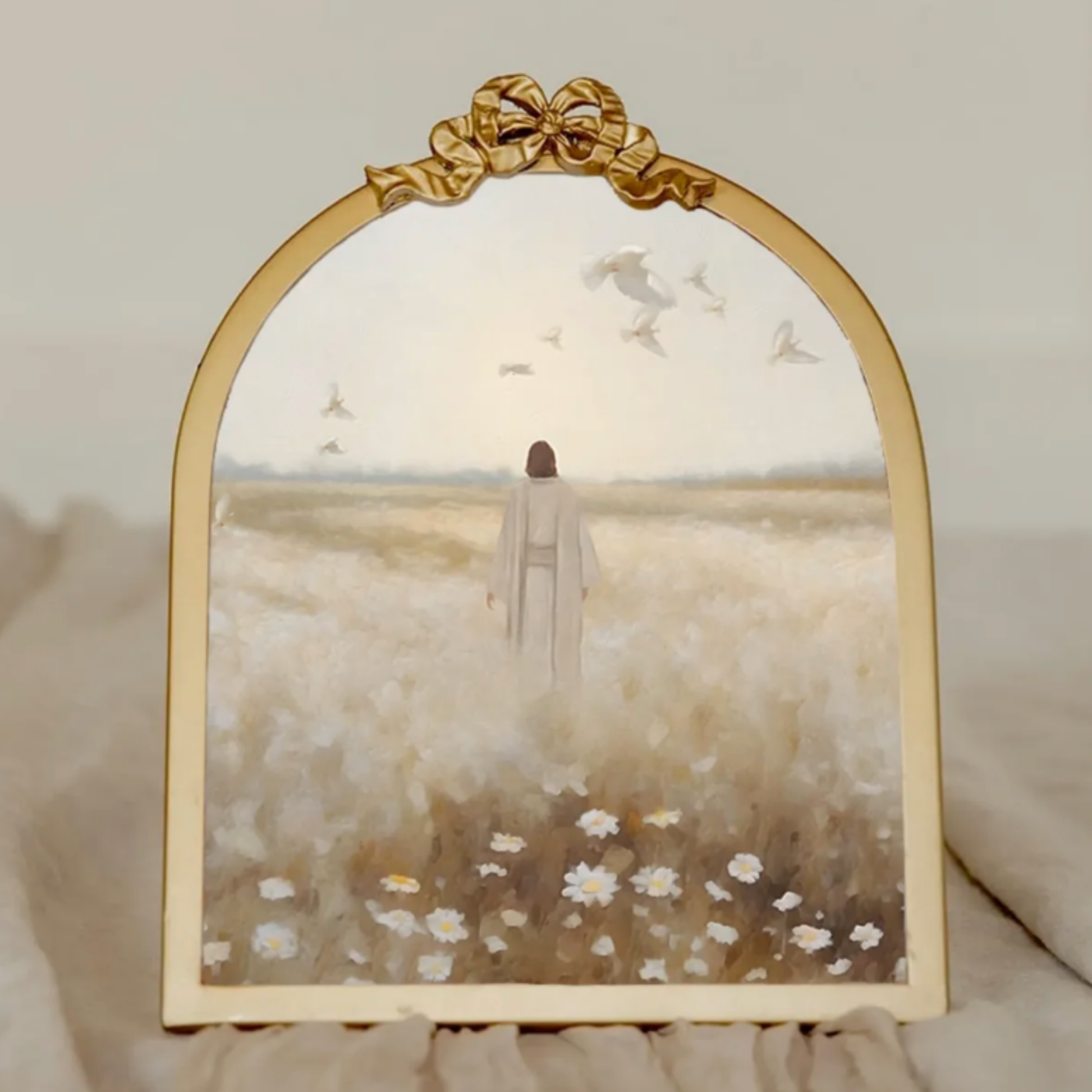 The final piece, Peace, is presented in a 5" × 7" vintage ribbon gold frame and features Jesus in a calm, serene setting—offering a moment of stillness and quiet reassurance.