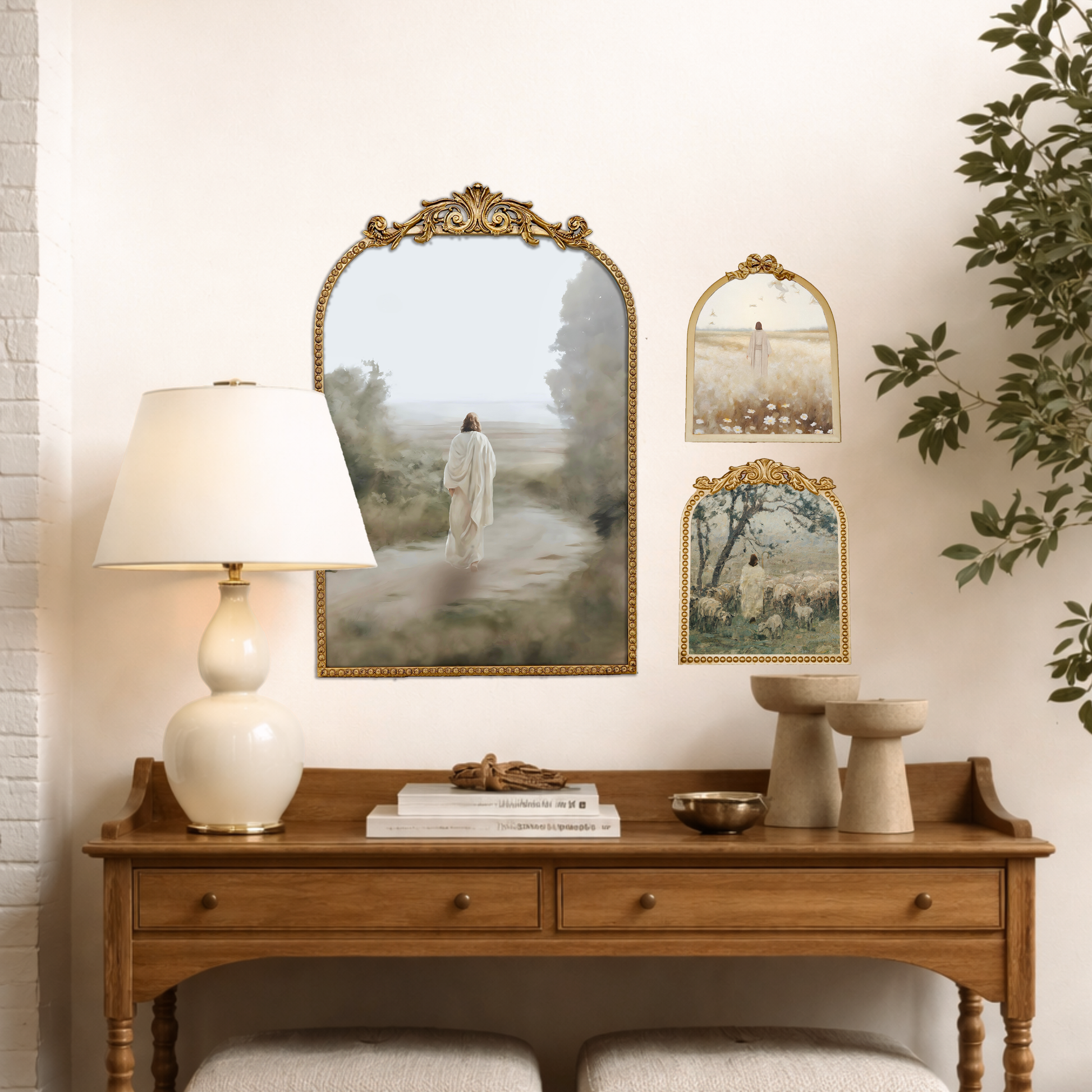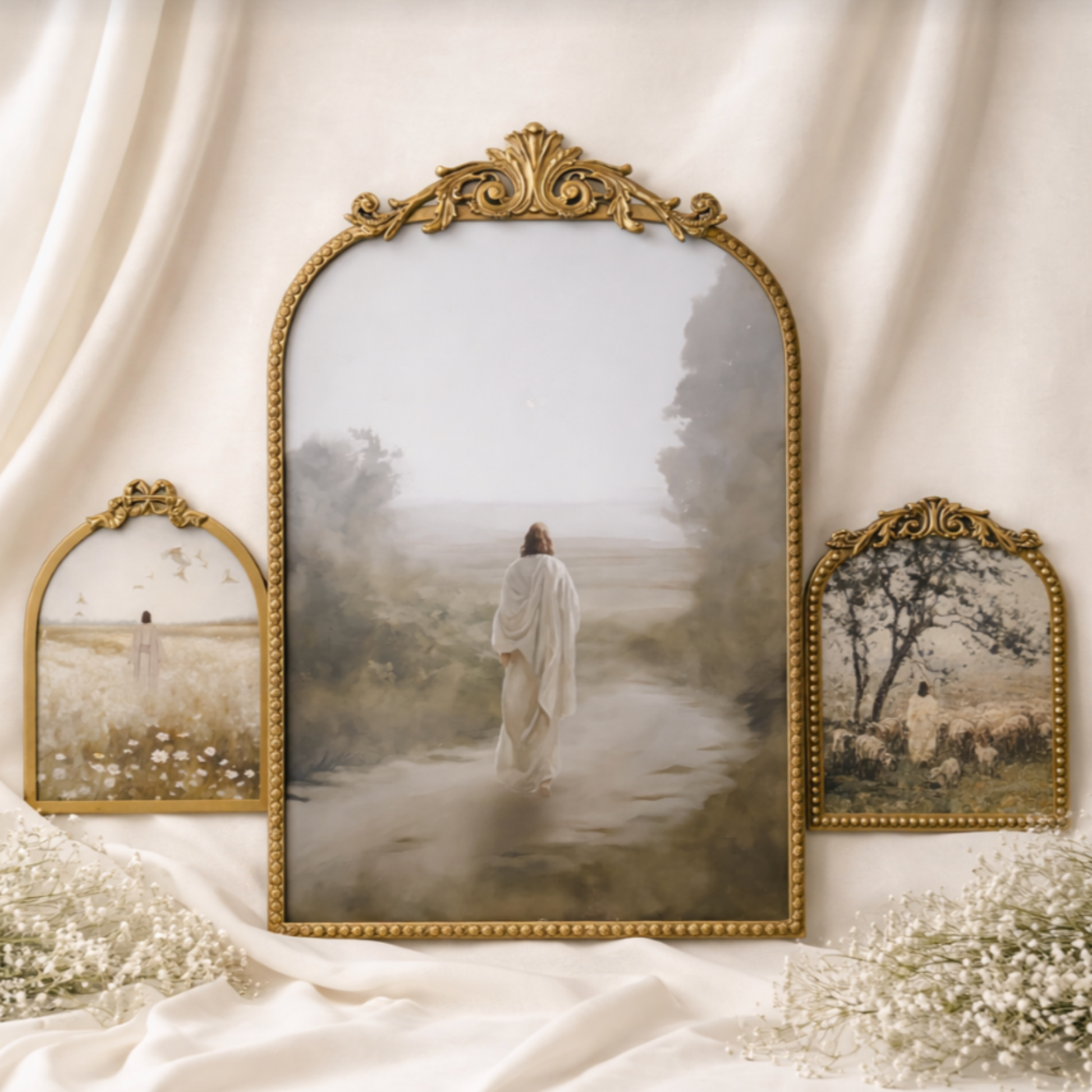 This thoughtfully curated set of three framed prints presents a layered meditation on guidance, care, and quiet faith through refined sacred imagery and varied scale.