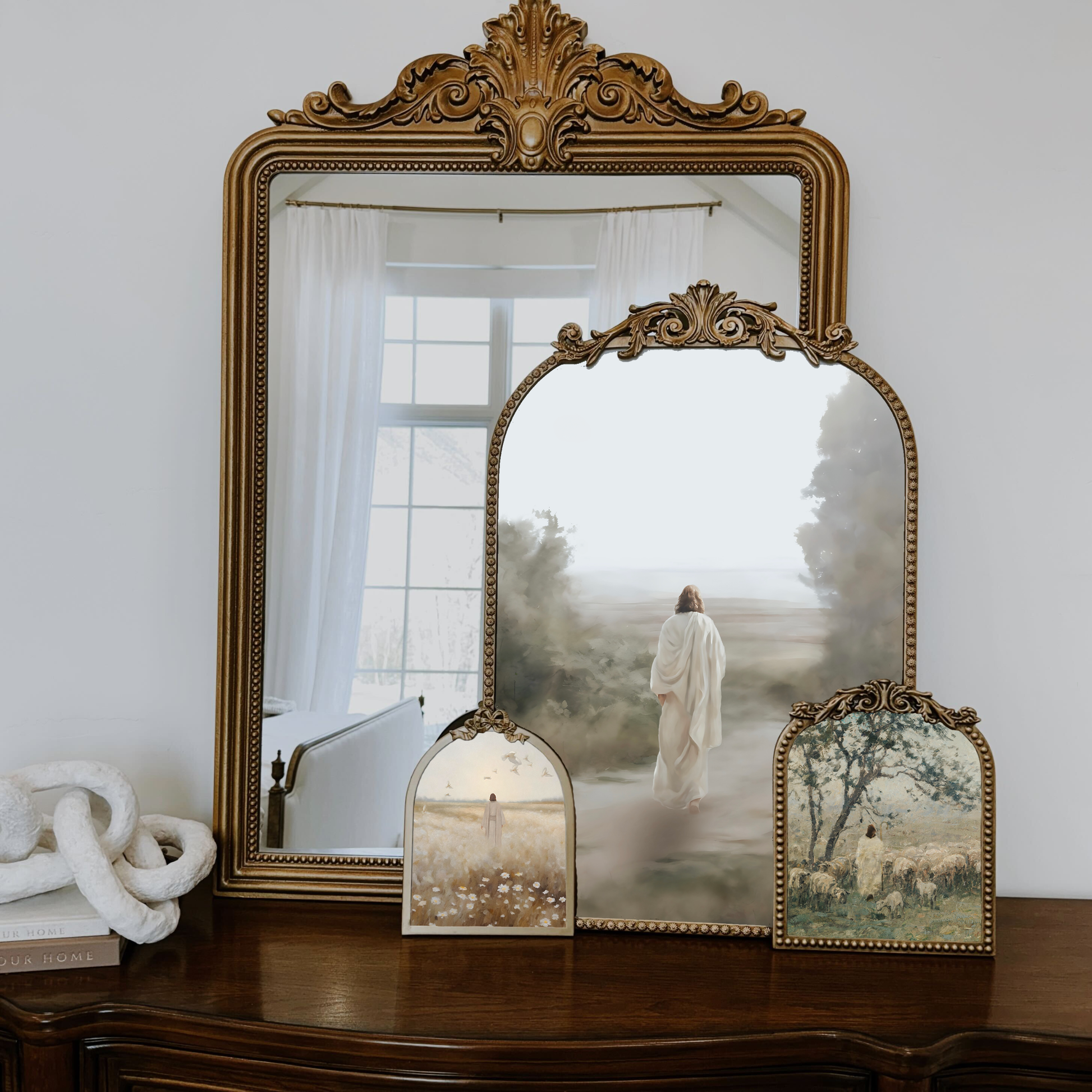 The second print, The Shepherd’s Call, is framed in a 9.5" × 11" vintage floral gold frame and depicts Jesus tending to a flock of sheep, symbolizing watchfulness, devotion, and gentle leadership.