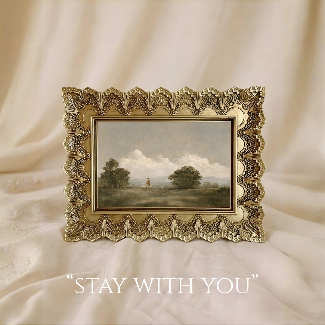 The second piece, Stay With You, is presented in a 8" × 10" vintage gold heritage frame and features Jesus in a calm, serene setting—offering a moment of stillness and quiet reassurance.